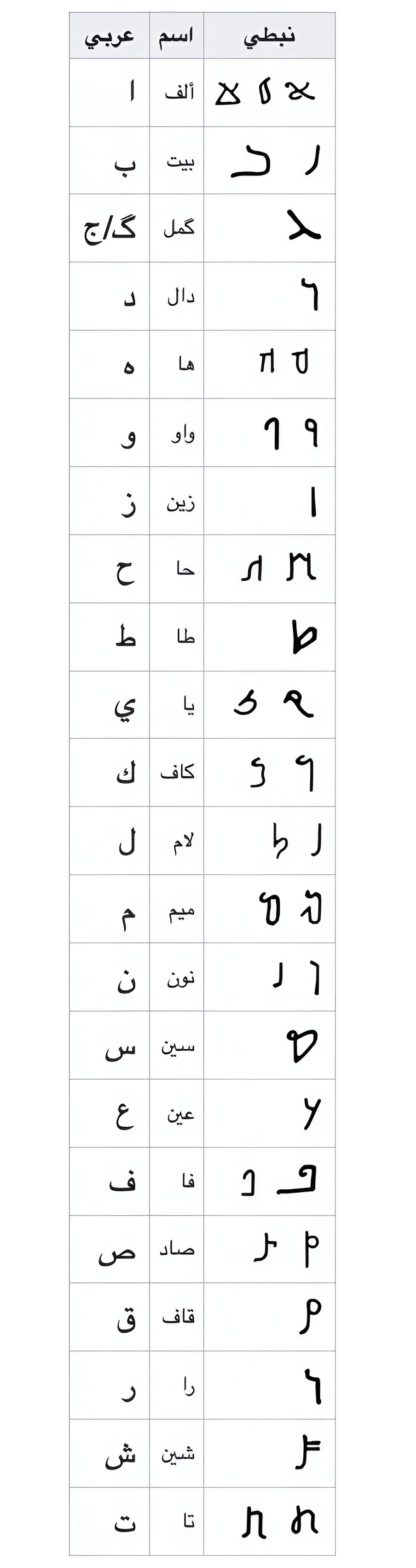 فيه شكل الحرف بالنبطي واسم الحرف والمقابل العربي له